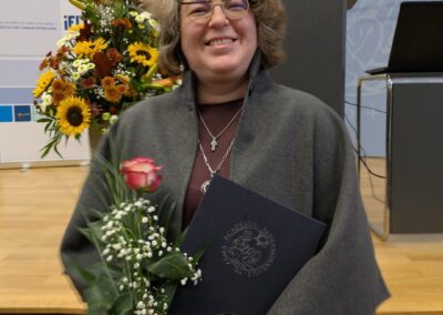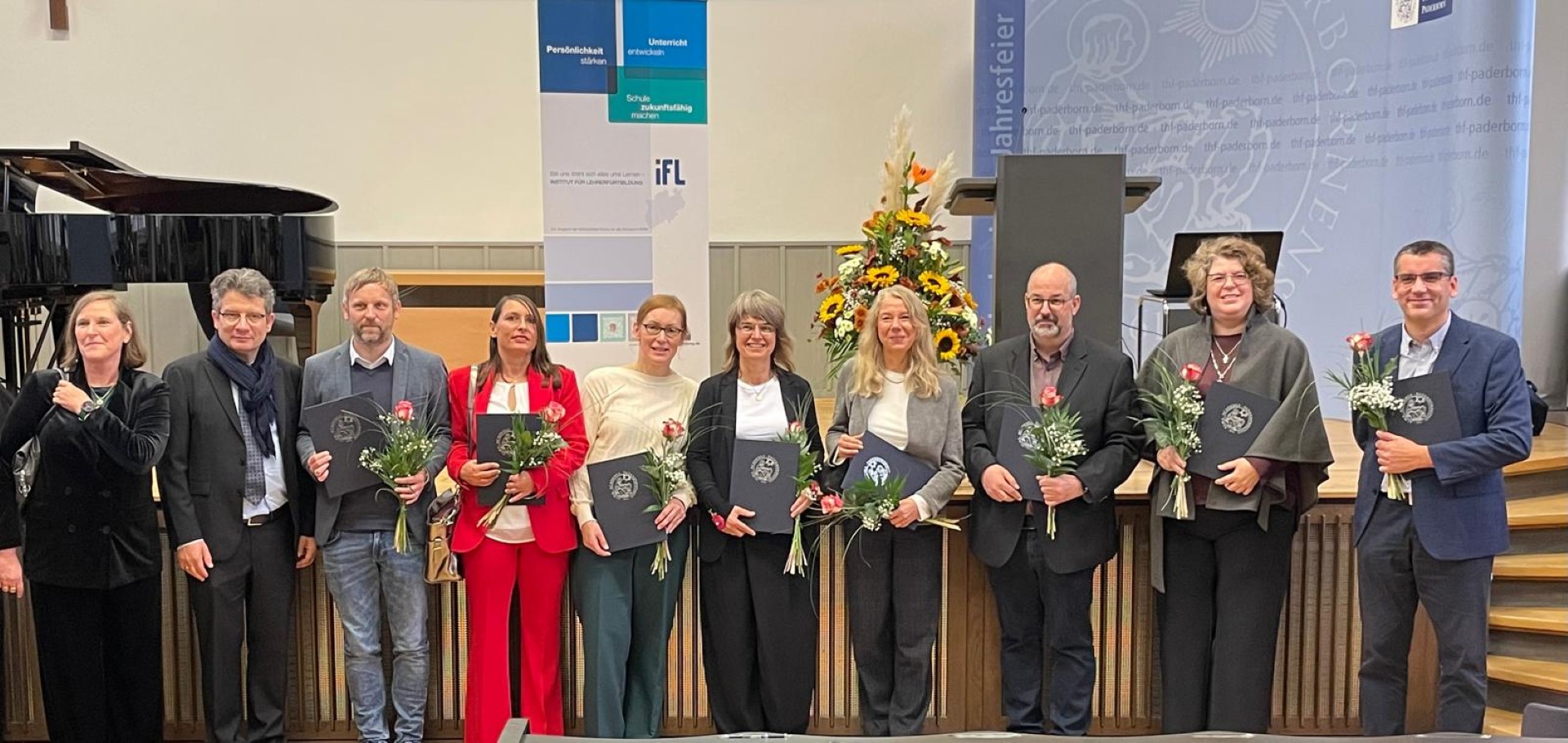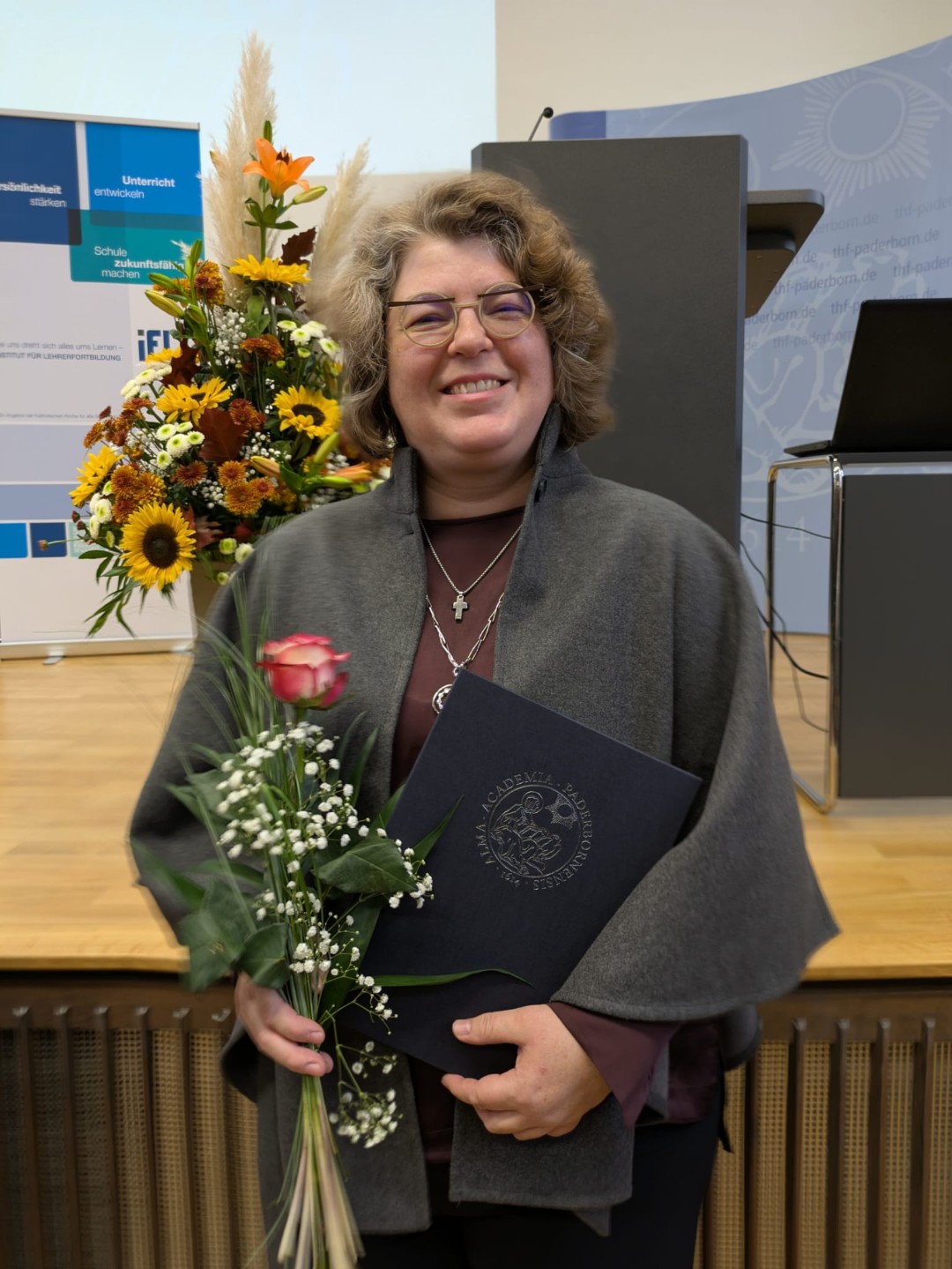 Normalerweise unterrichtet Frau Keßler Niederländisch und Deutsch bei uns am KAG. Nun hat sie neben dem Beruf beim Institut für Lehrerfortbildung in Essen (ifl) fast fünf Jahre lang Katholische Religion für die Sek I und Sek II studiert – und in den Ferien ihre Masterurkunde erhalten! Während der feierlichen Semestereröffnung der theologischen Fakultät der Universität Paderborn, dem das ifl angeschlossen ist, überreichte der Dekan der Fakultät den AbsolventInnen ihre Abschlussurkunden.
