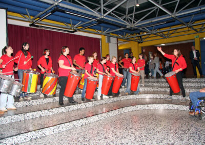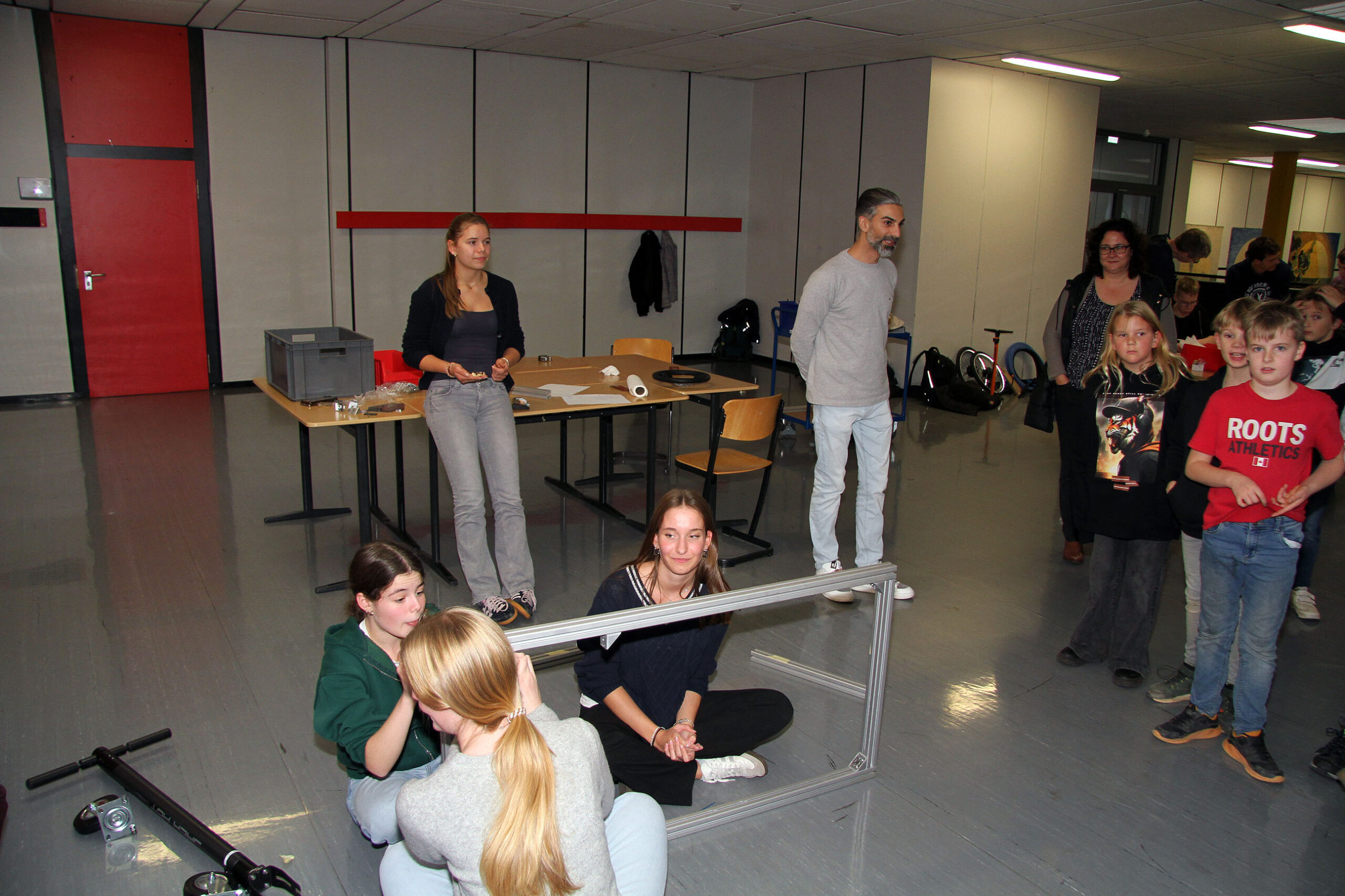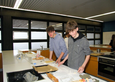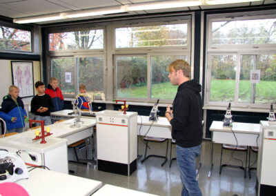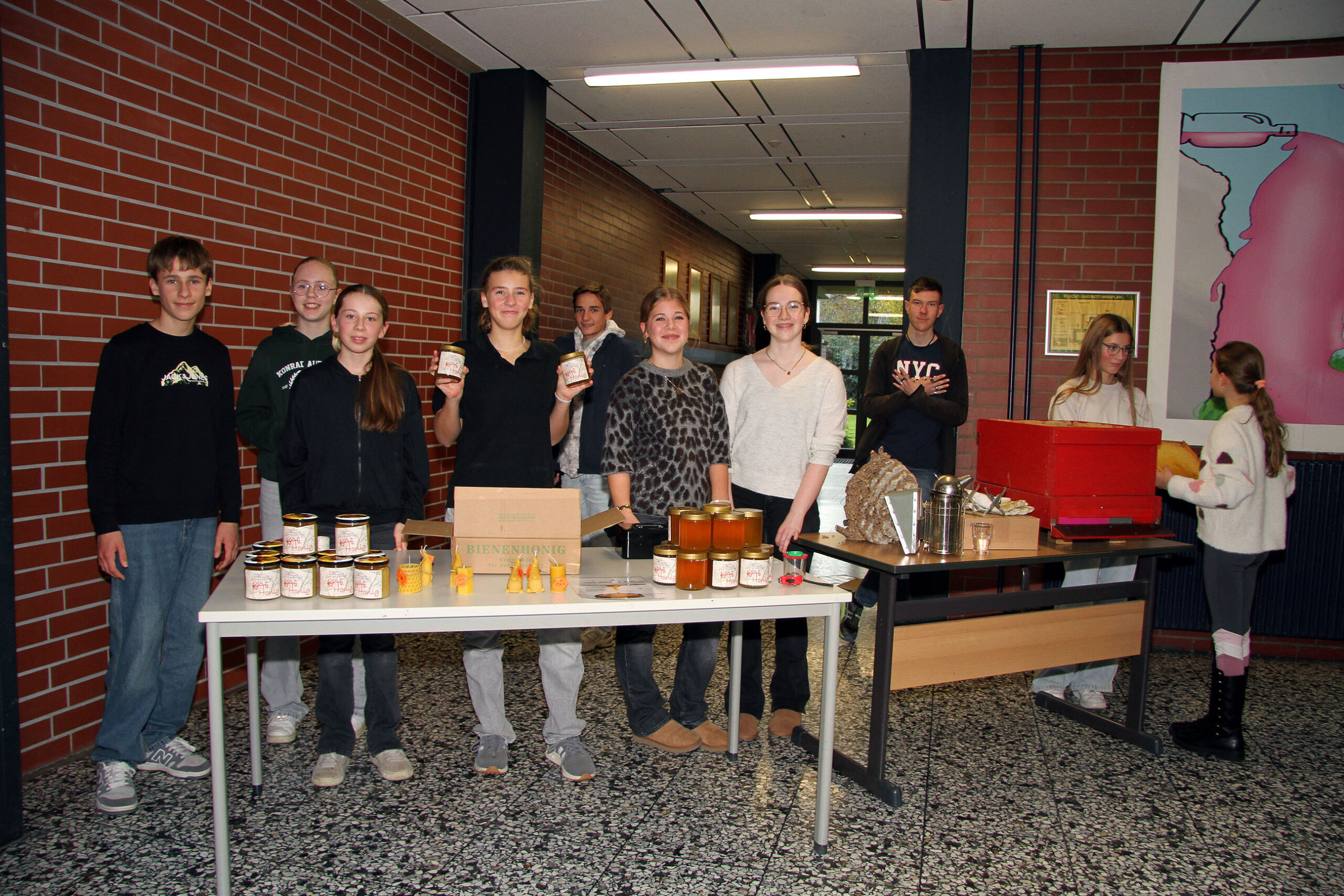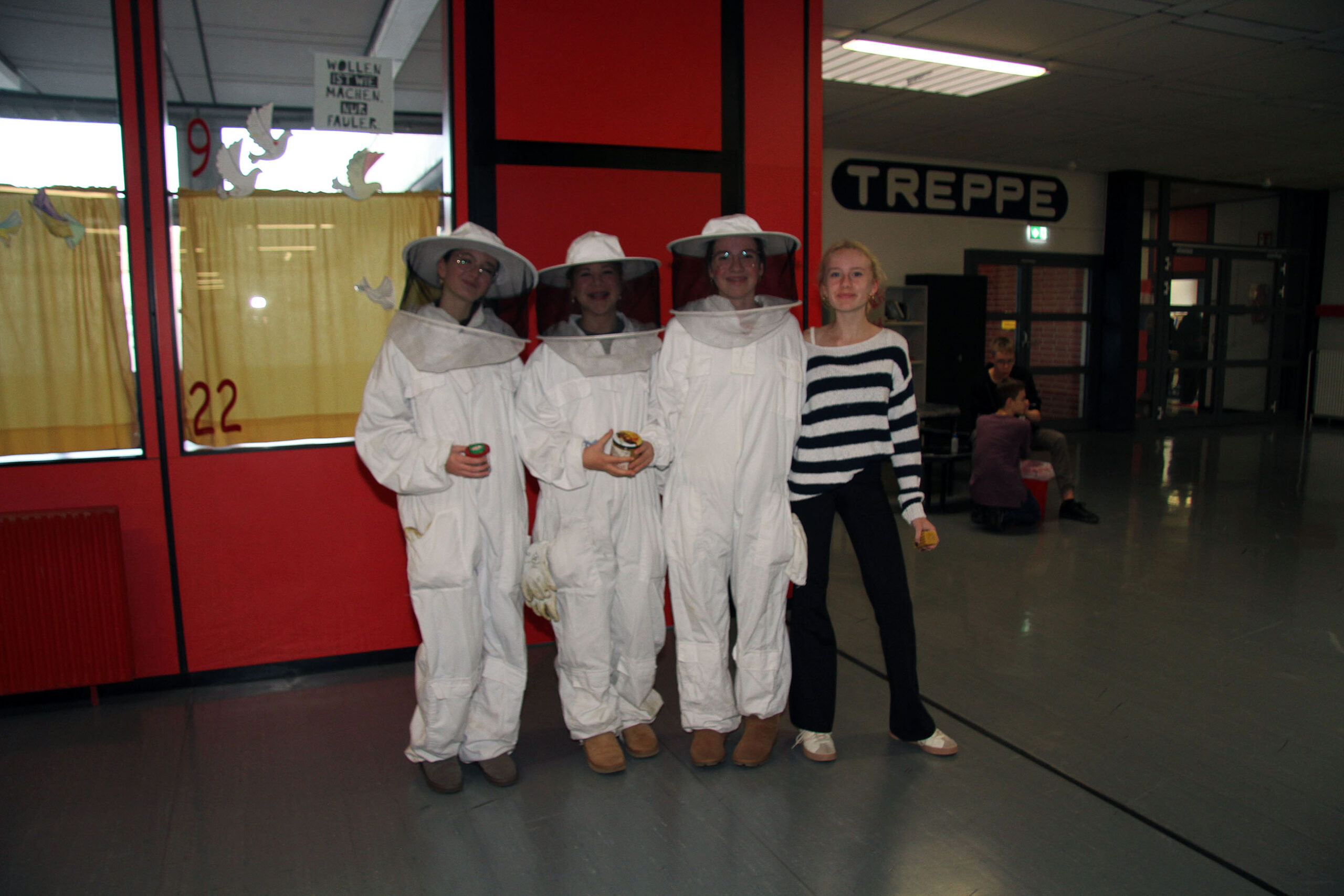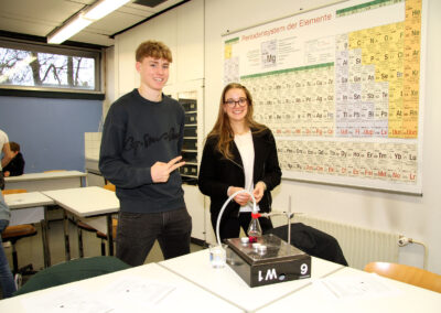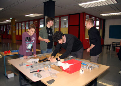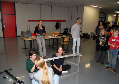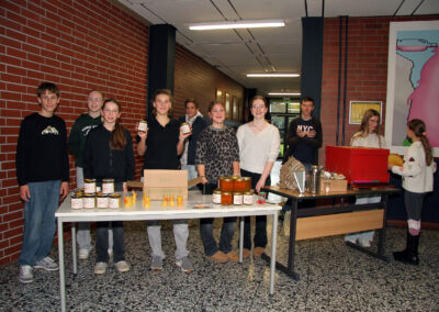 Viele WPUS (auch Imkern, mit einem erfolgreichen Verkauf des selbstgeschleuderten Honigs!) stellten sich vor, und so musste man sich zum Beispiel in der oberen Etage in Acht nehmen, damit man dem von unseren SchülerInnen in Zusammenarbeit mit der Hochschule Rhein-Waal selbstgebauten, ziemlich flotten „Motorrad“ des WPU Mechatronik rechtzeitig auswich. Aber noch viel mehr gab es zu sehen: die Naturwissenschaften stellten sich mit verschiedenen Experimenten vor, im Niederländisch-Raum konnte man niederländische Stroopwafels probieren, Instrumente konnten angetestet werden, und natürlich konnte man einer Probe der Konga Quings zuhören (für empfindliche Ohren mit Gehörschutz). Bei der Technik konnten kleine Kerzenhalter aus Holz ausgesägt sowie die schönen Werke vergangener Kurse bewundert werden und und und…
