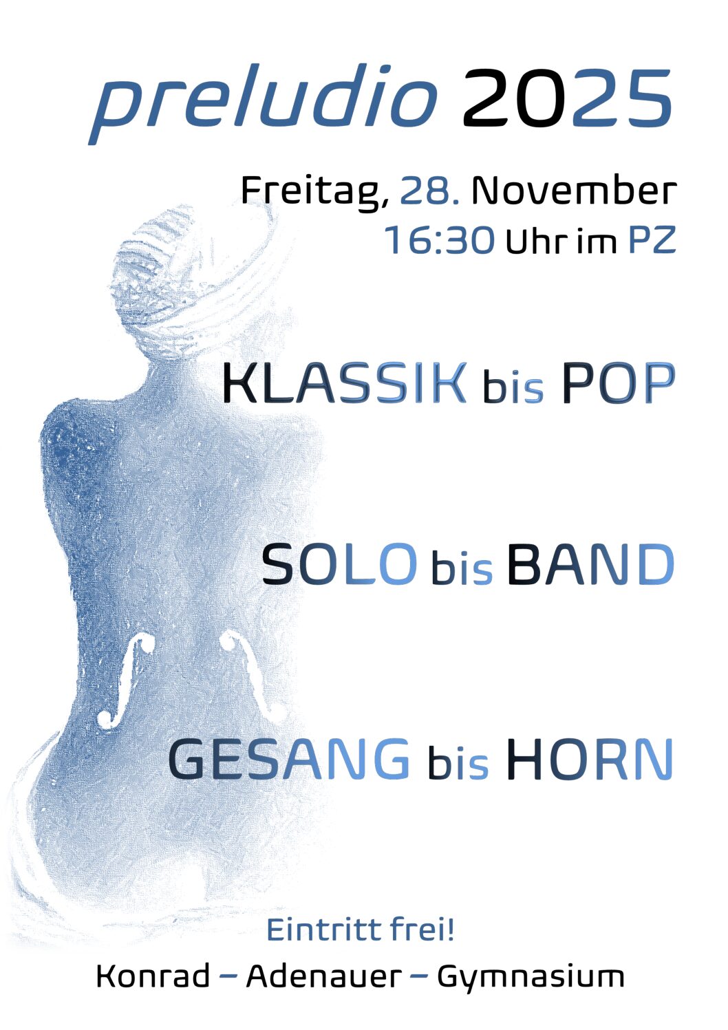 Am Freitag, 28. November 2025, um 16:30 Uhr Uhr öffnet das Konrad-Adenauer-Gymnasium in Kellen die Bühne für Solisten und kleine Ensembles. Von „Klassik bis Pop, Solo bis Band und Gesang bis Horn“ werden die unterschiedlichen Darbietungen der SchülerInnen umrissen. Die Programme der großen Schulkonzerte vor den Osterferien sind mit den zahlreichen Schulensembles wie Chören, Kongas Quings, Big Band und Nachwuchsensembles gut gefüllt, sodass die Konzertreihe „preludio“ sowohl klassisch ausgebildeten Musikern wie auch Interpreten