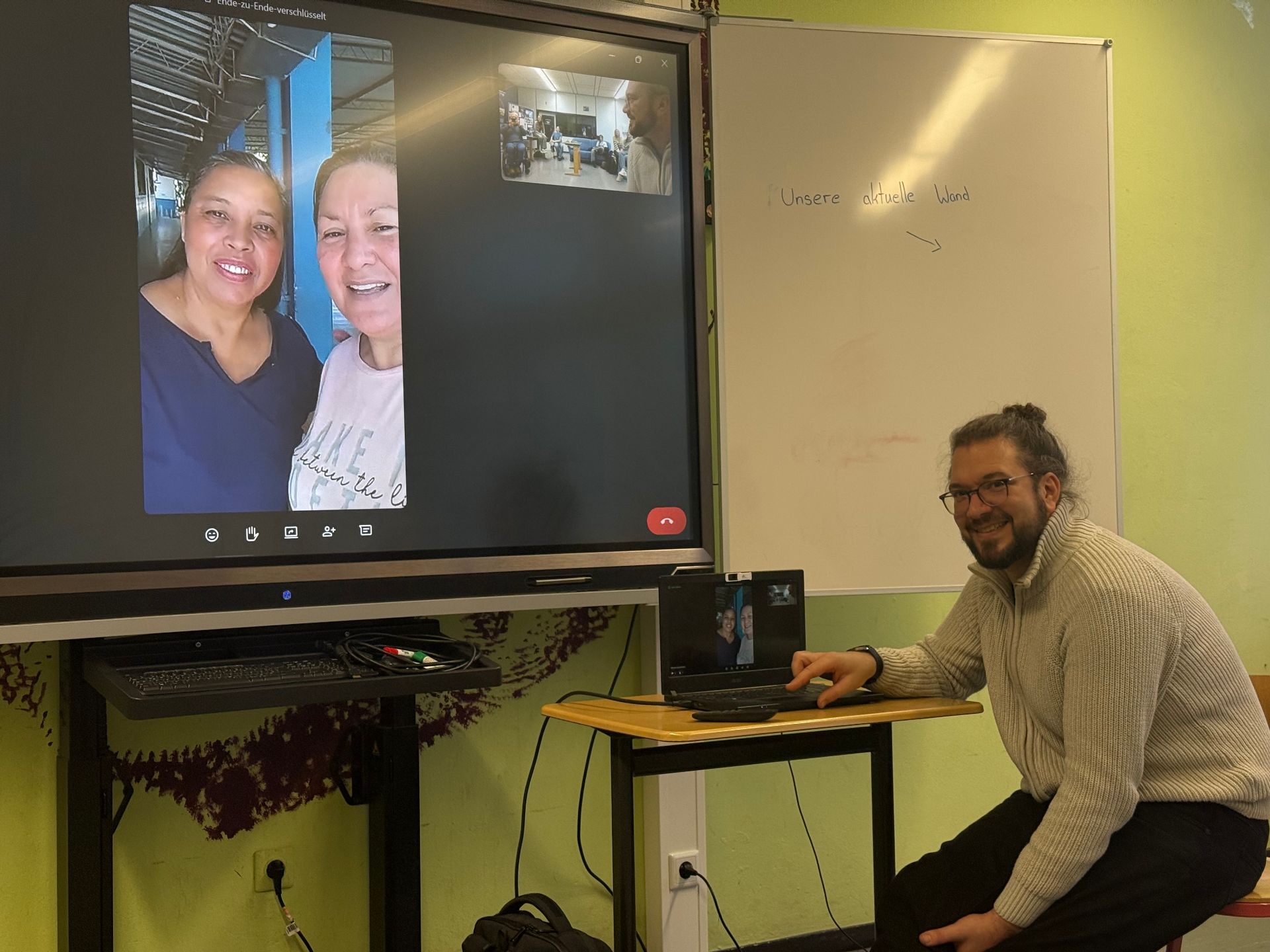 Am Freitagnachmittag, 5.12., trafen sich einige Mitglieder der Eine-Welt AG Fairständnis zusammen mit ihren Lehrern Frau Seidler, Herrn Thimm und Herrn Janßen zu einer ersten Videokonferenz mit den beiden Lehrerinnen Carmen Ventura und Estela Guardado aus unserer Partnerschule, dem Centro Escolar in Nueva Esperanza / El Salvador. Vorbereitet und übersetzt wurde die Videokonferenz dankenswerterweise von Herrn Thimm.