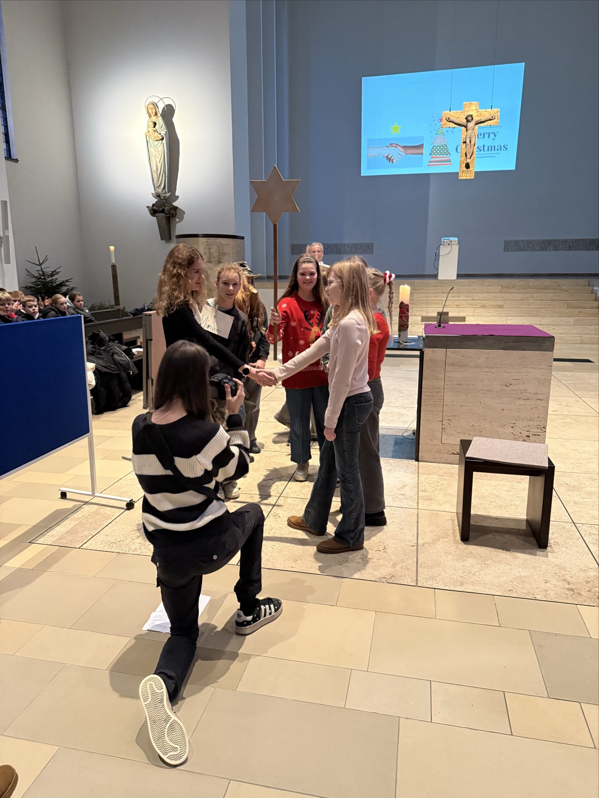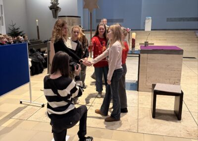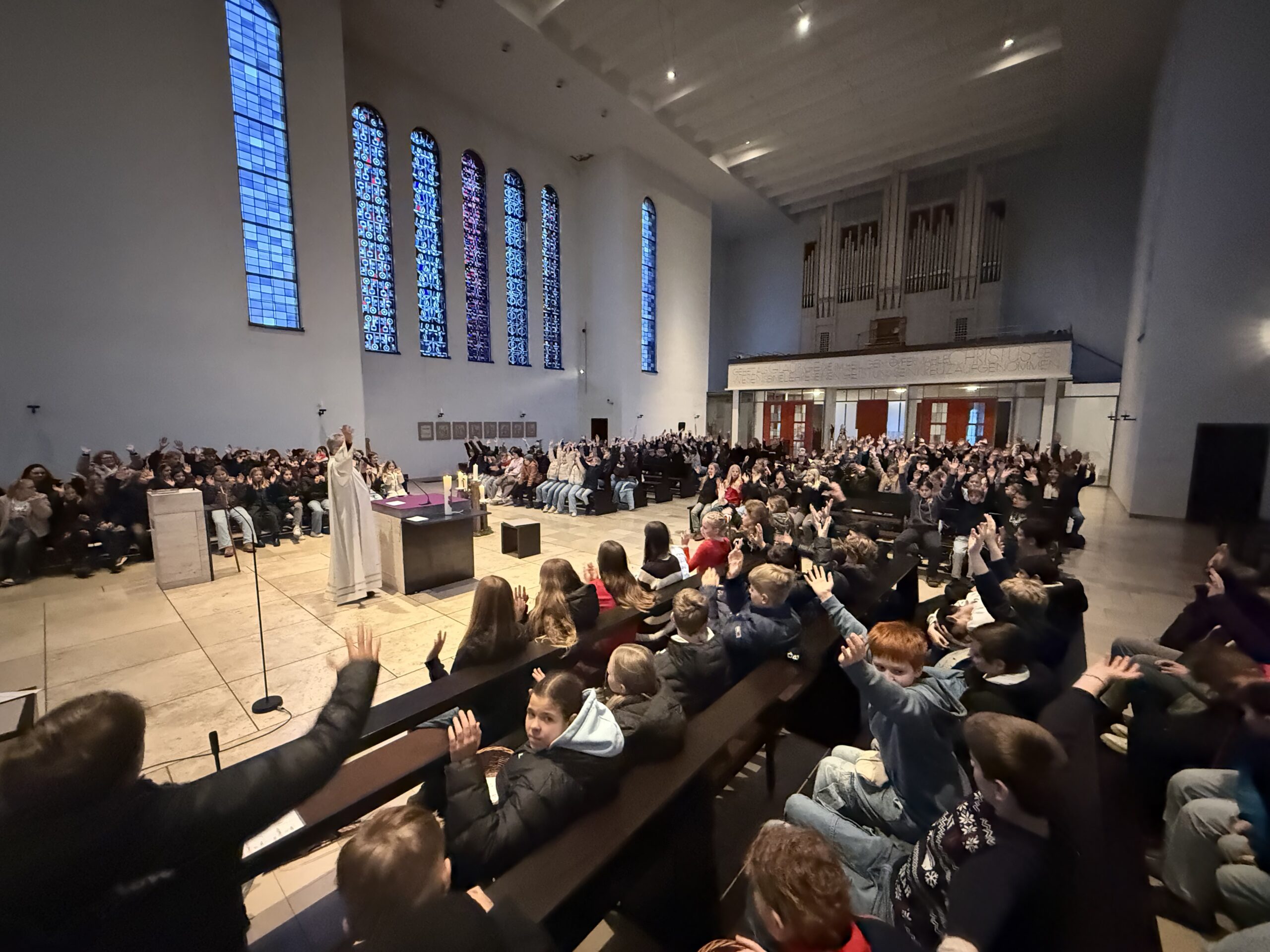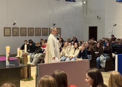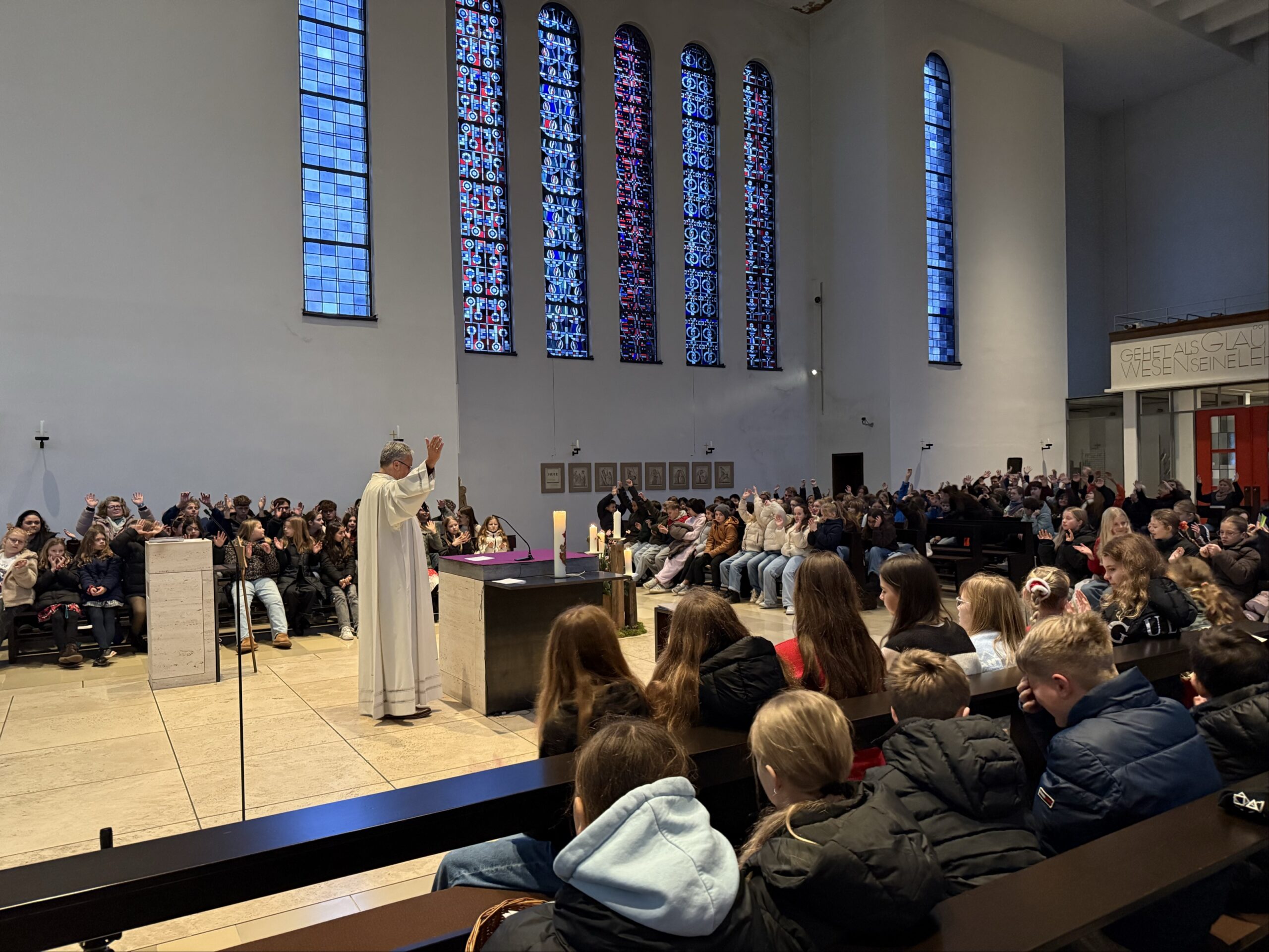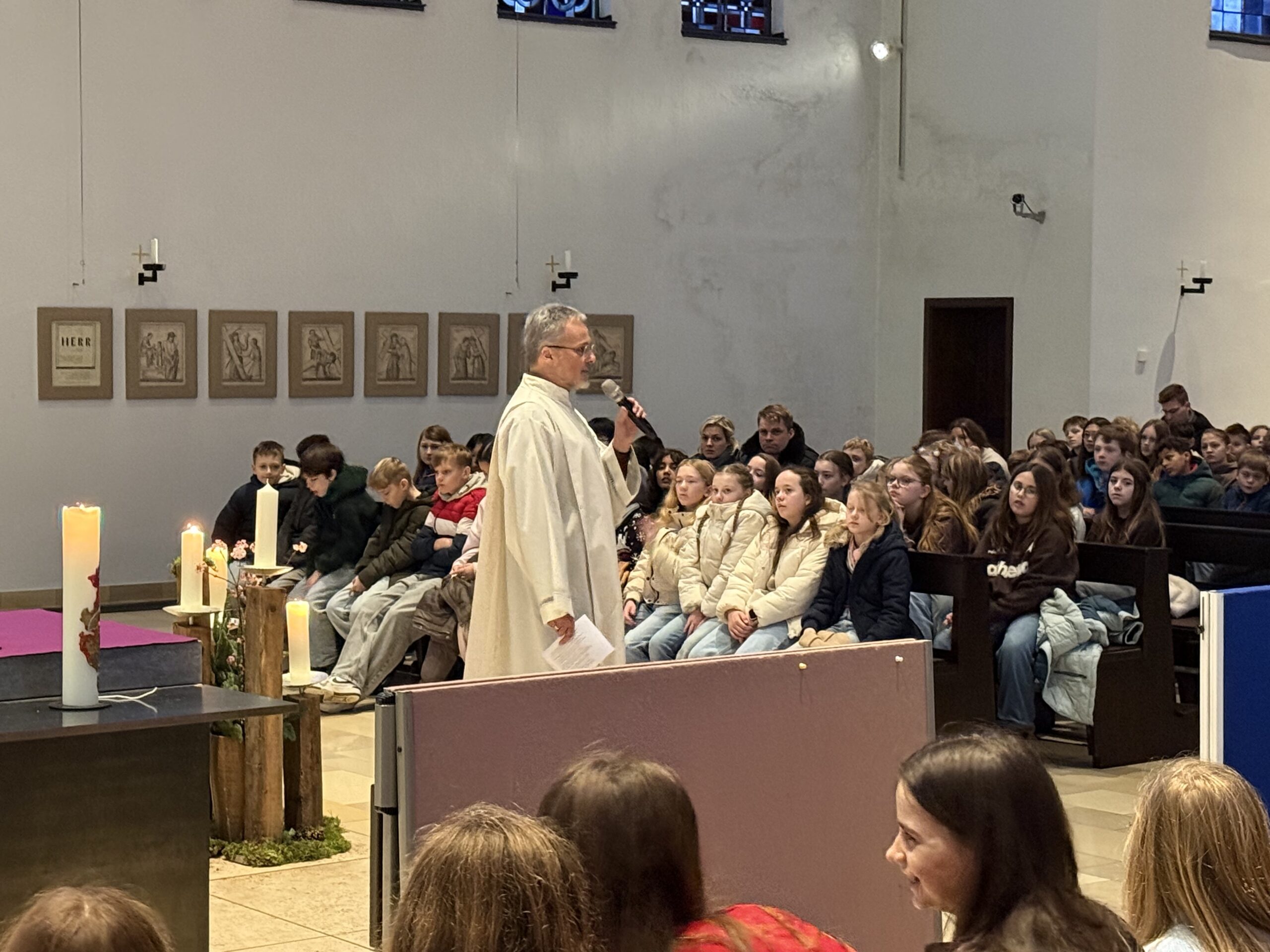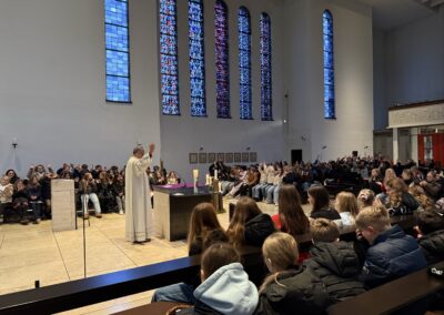 Zuvor waren die SchülerInnen der Jahrgangsstufen 5, 6 und 7 zum Gottesdienst in die St. Willibrord-Kirche eingeladen. Herr van Berlo führte durch den Gottesdienst, den mehrere Gruppen aus den 6. Klassen vorbereitet hatten.