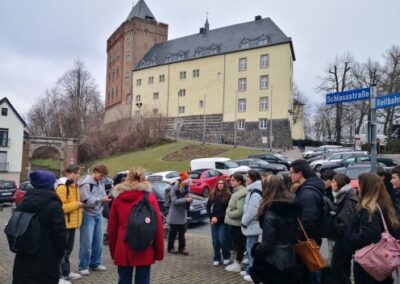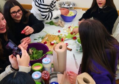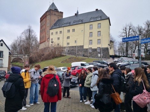 Am Donnerstag präsentierten wir stolz deutsche, karnevalistische Traditionen mit bunten Kostümen, Tanz und Polonaise in der Pausenhalle. Vorher und nachher besuchten die Italiener unseren Unterricht und staunten über die vollen Klassen, aber auch über den lebhaften Unterricht. Der Nachmittag stand zur freien Verfügung und wurde zum Bowlen und für Lasertag genutzt. Am letzten Tag der Schulwoche trafen wir uns alle am Stein, um kleine Präsentationen zum Thema „Italien und Deutschland – Gemeinsamkeiten und Unterschiede“ vorzubereiten. Während die Schulsysteme und die Essensgewohnheiten (Ananas auf Pizza??? Käse auf Brot??? Zwieback zum Frühstück???) recht unterschiedlich sind, verbringen italienische und deutsche Jugendliche ihre Freizeit nahezu gleich (am Handy halt :-)).