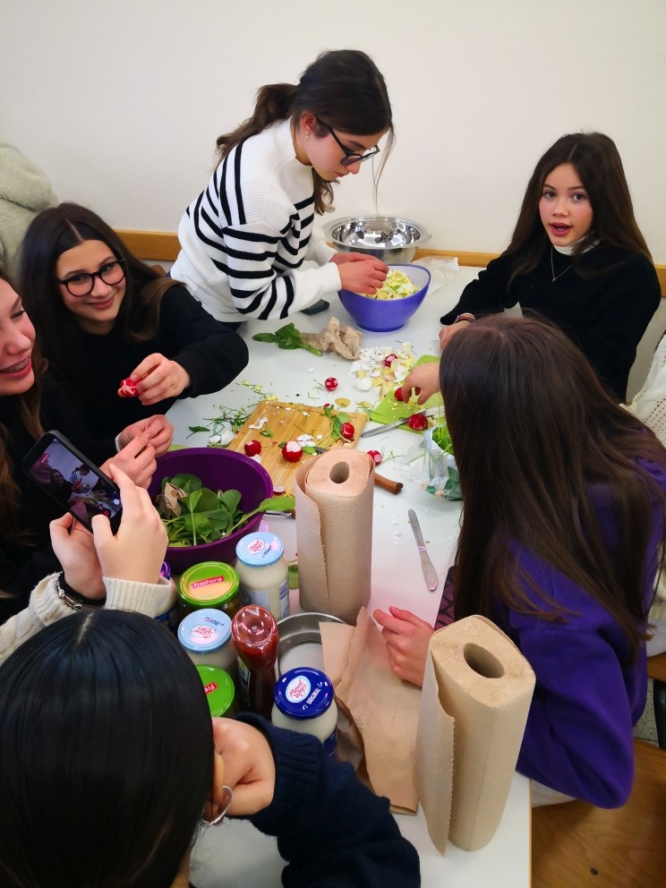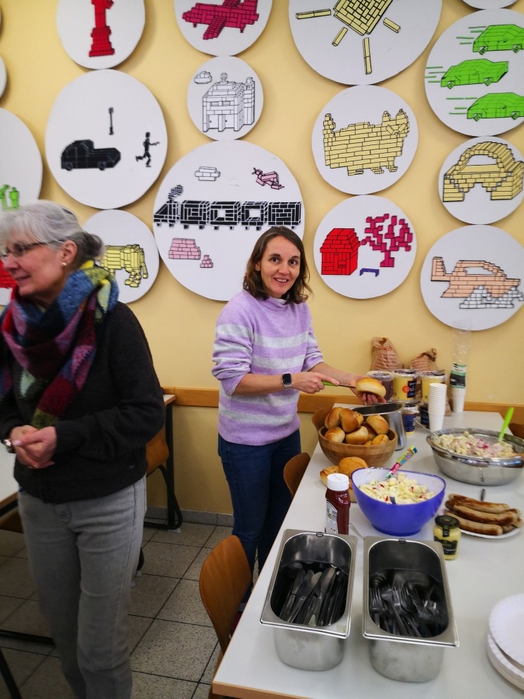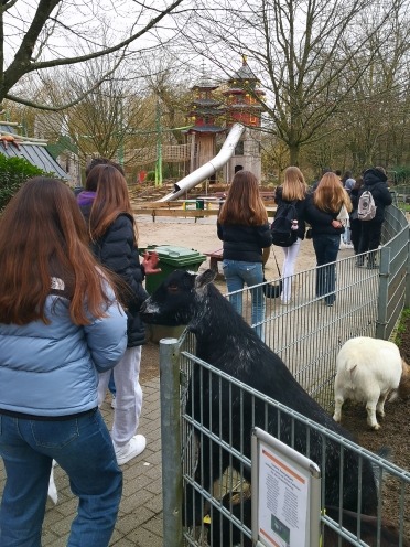 Am Abend organisierten die EFler privat eine Geburtstagsfeier für eine italienische Austauschschülerin, Margarita, die in Kleve ihr 14. Lebensjahr begann. Schneller als erwartet, war der letzte Tag (Samstag) gekommen, der erst mal zum ausführlichen Ausschlafen nach einer anstrengenden Schulwoche genutzt. Nachmittags trafen sich alle im Tiergarten, wo mit großer Begeisterung Ziegen gefüttert und Präriehunde bestaunt wurden. Herzlichen Dank an den Förderverein des Klever Tiergartens, der uns Freikarten spendiert hat! Nach zwei Stunden waren alle durchgefroren und begaben sich gern in die Wärme des Stein-Gymnasiums. Es wurde fröhlich geschnippelt und gerührt und nach kurzer Zeit erfreuten sich alle an Kartoffelsalat und Grillwürstchen. Am frühen Sonntagmorgen waren sich alle einig: Gut, dass wir uns alle schon in drei Wochen in Campi wiedersehen werden! Sonst wären doch glatt einige Tränen bei der Verabschiedung auf dem Busparklatz geflossen…
