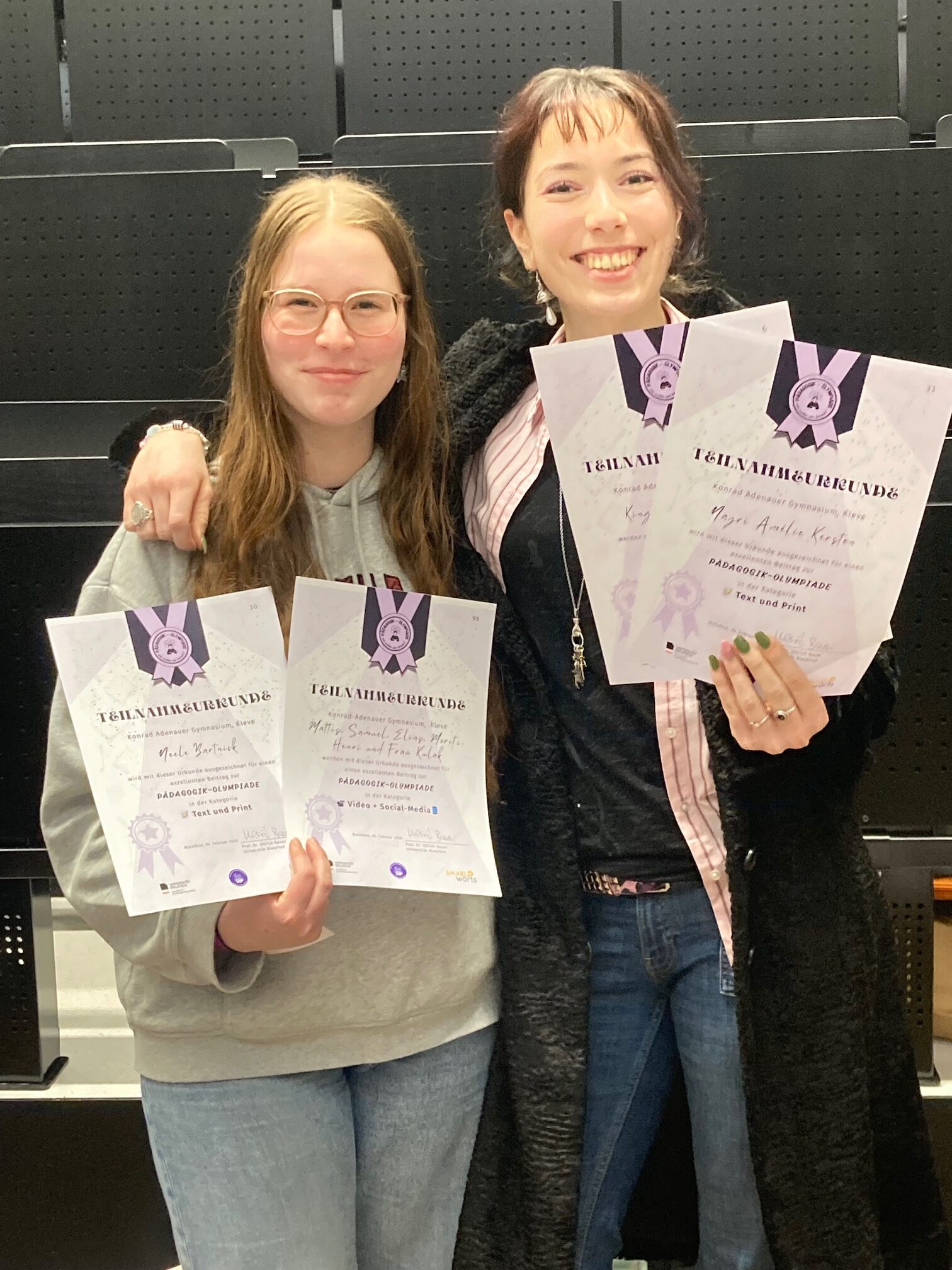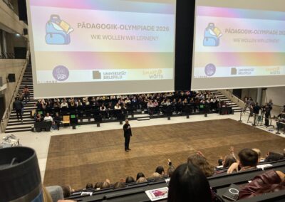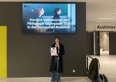 Gemeinsam mit Frau van den Bruck hatten drei Schüler ihres EF Pädagogik-Kurses die Möglichkeit in Bielefeld der Siegerehrung der diesjährigen Pädagogik Olympiade unter der Leitfrage „Wie wollen wir lernen?“ beizuwohnen. Von den vier Beiträgen unserer Stufe war sogar einer in den Top 10, und obwohl nicht jeder, der einen Beitrag eingesandt hatte, die Möglichkeit bekommt hat nach Bielefeld an die Uni anzureisen, so war es doch für alle eine tolle Erfahrung daran mitzuarbeiten.