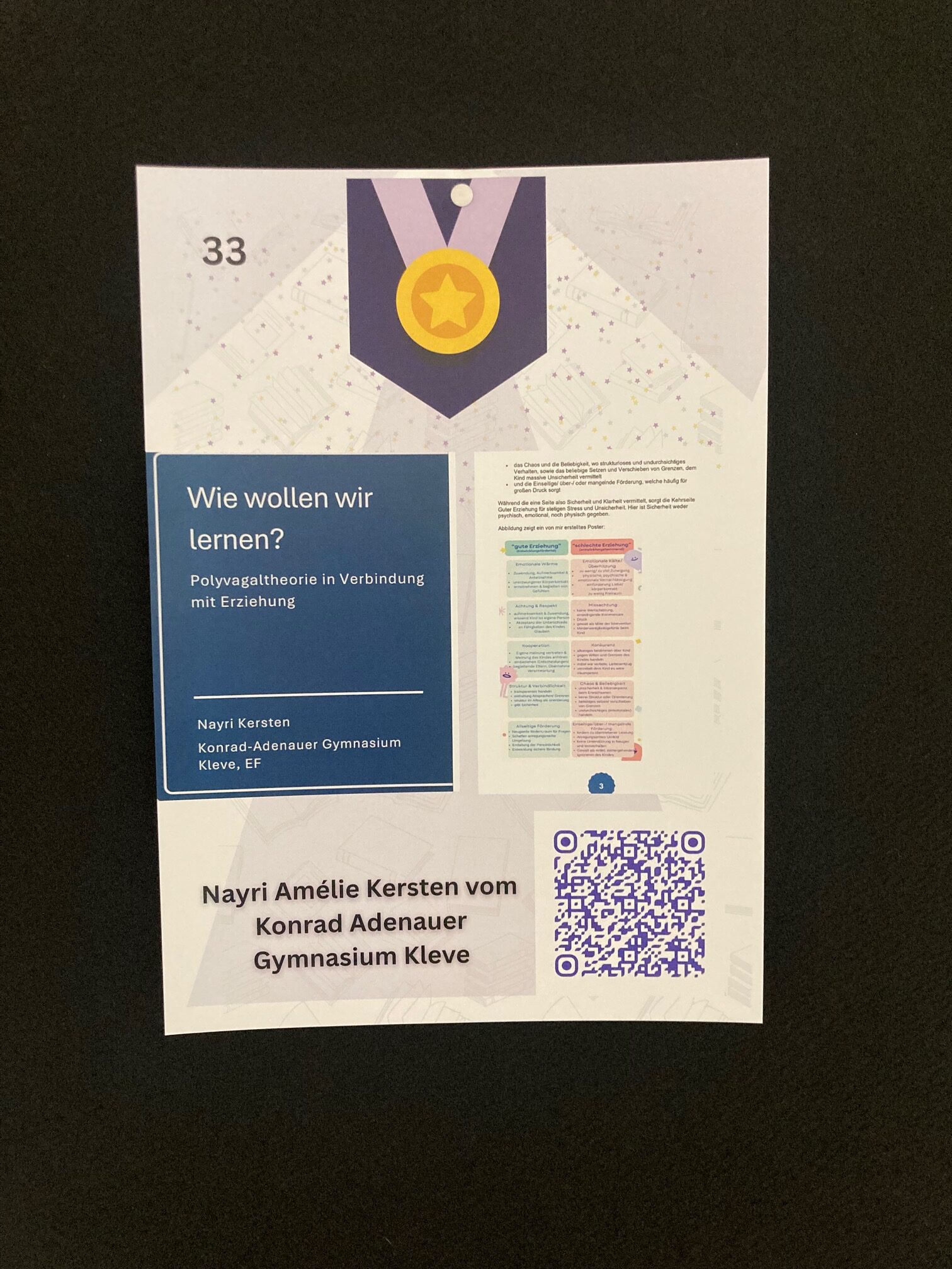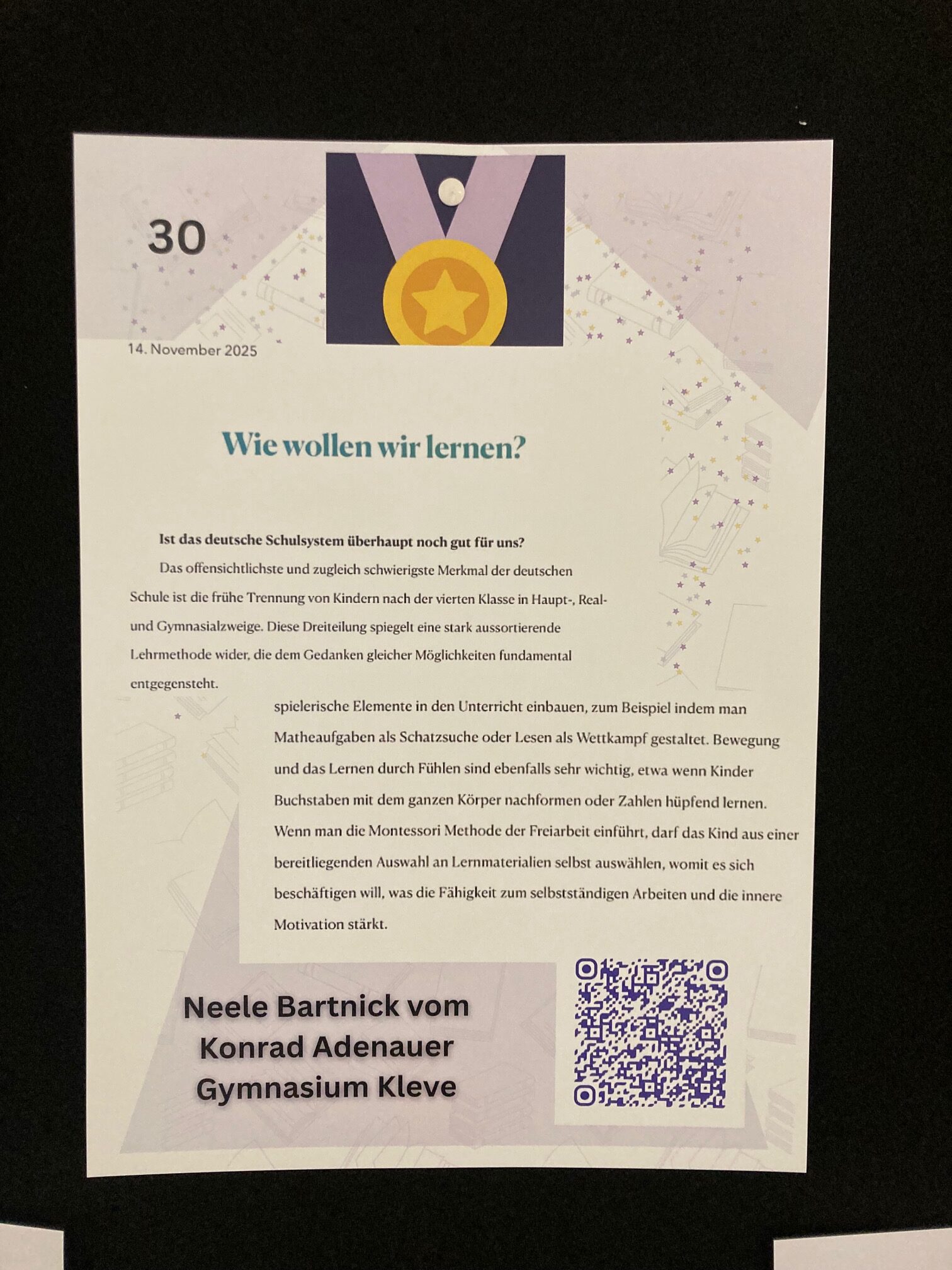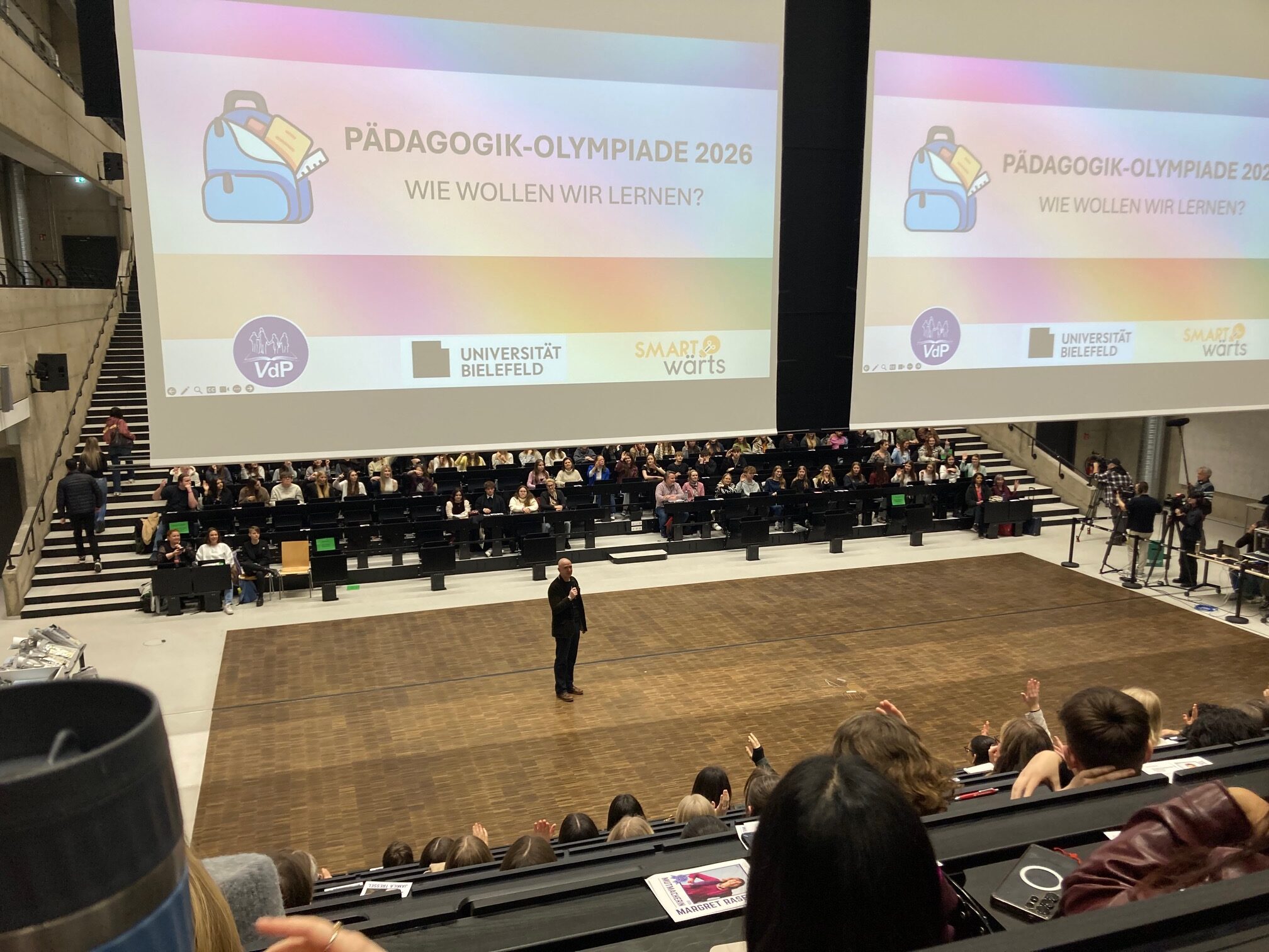 Am Freitag, den 20.02.26 war ich mit Nayri Kersten, Christina Schirling und Frau van den Bruck bei der Pädagogik Olympiade 2026 in Bielefeld. Nayris Vater war so nett und hatte Nayri und mich mit dem Auto gefahren. Wir sind ca. 3 Stunden gefahren. An der Universität Bielefeld waren einige der Einreichungen ausgehängt mit ihrer Platzierung. Zudem gab es Plätzchen und wir Schüler haben ein pinkes Bändchen bekommen, mit dem wir später in der Mittagspause unser Mittagessen umsonst in der Mensa bekommen haben. 🙂