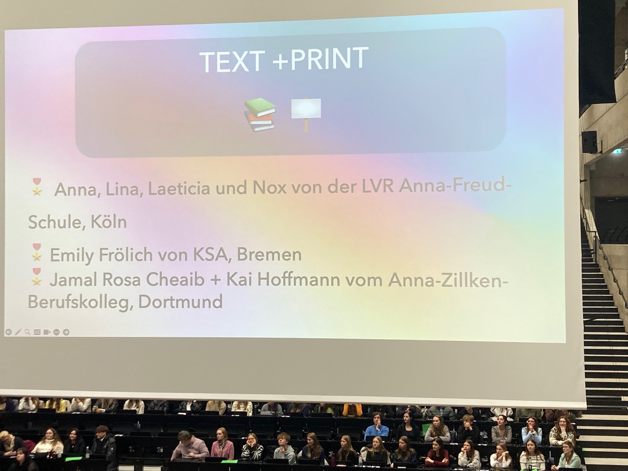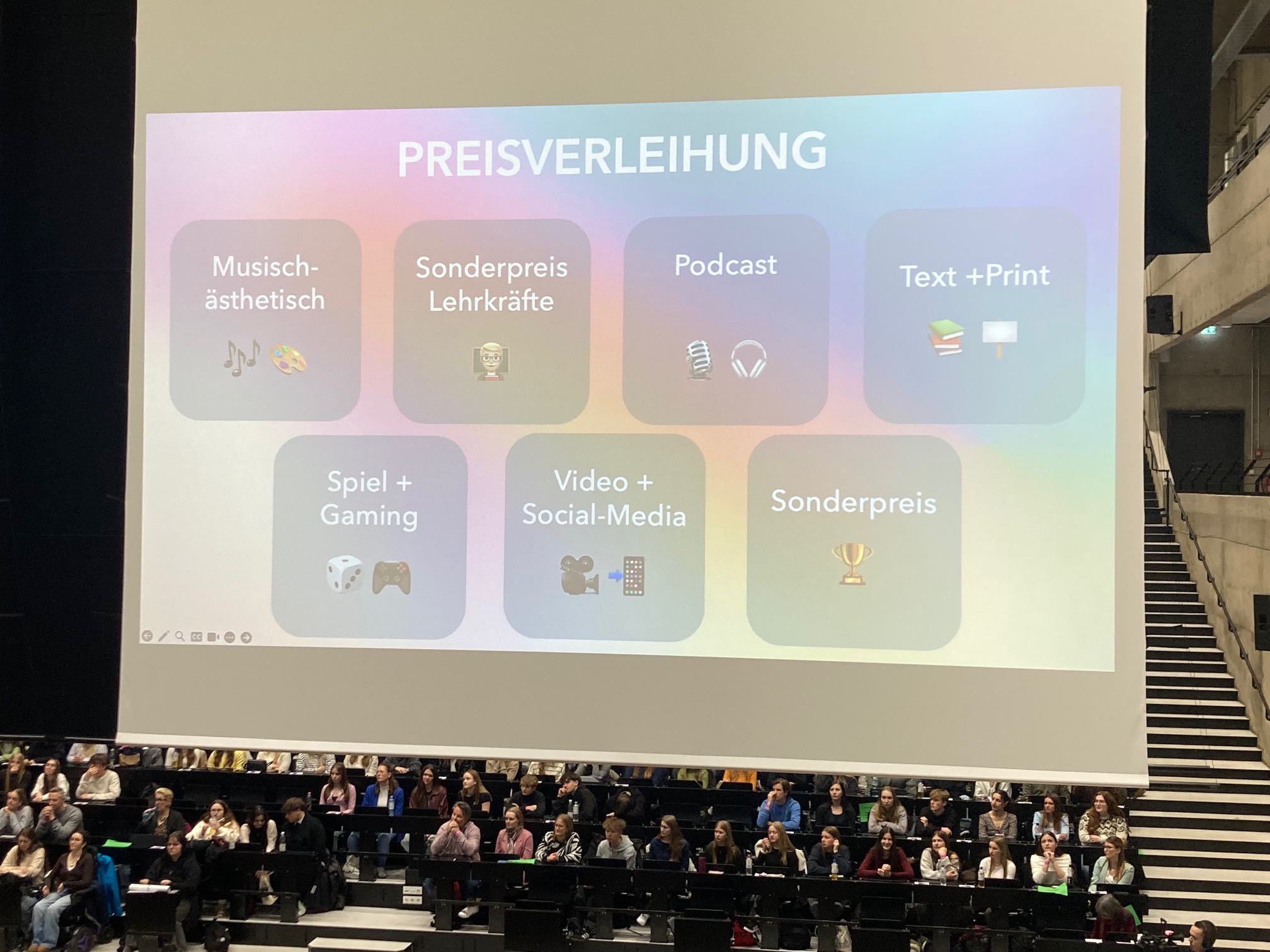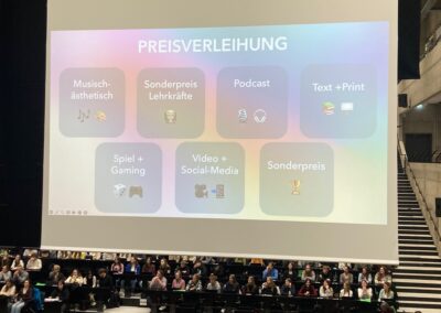 Nach der Mittagspause wurden die besten drei Einreichungen jeder Kategorie in einem 5 minutigen Video geehrt und haben Preise bekommen. Der Gewinner des ersten Platzes wurde nach vorne geholt und interviewt. Um 15.45 Uhr war die Veranstaltung beendet. Es war ein sehr schönes Erlebnis. Vielen Dank an Nayri Kersten, dass du uns über deine Einladung mitgenommen hast und vielen Dank an Frau van den Bruck, dass sie uns die Teilnahme ermöglicht hat!