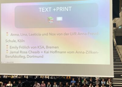 Um 11 Uhr ging die Veranstaltung los. Wir saßen im Audimax. Mehrere Personen haben einen Vortrag gehalten. Am meisten beindruckt hat mich der Vortrag von Margaret Rasfeld und Jamila Tressel. Sie haben von zwei neuen Schulfächern erzählt, die es auch schon an ein paar Schulen gibt: „Herausforderungen“ und „Verantwortung“. Margaret Rasfeld war Schuldirektorin an einer Schule, die diese Fächer unterrichtet. Jamila Tressel war selbst früher auf dieser Schule und erzählte von ihren Erfahrungen mit dem Fach „Herausforderungen“. Dieses Fach beinhaltet, dass man sich selbst einer Herausforderung stellt, auf die man sich ein Jahr lang in der Schule vorbereitet. Z.B., dass man für drei Wochen in einer Gruppe nach England geht – mit nur 5€ pro Person am Tag! Egal wie das Wetter ist! Unter anderem war es auch eine Herausforderung, bei fremden Menschen zu klingeln und zu fragen, ob man z.B. im Garten übernachten darf. Die Schüler haben berichtet, dass sie positiv überrascht waren, wie freundlich viele Menschen sind. Diese Stellung einer Herausforderung gibt es 3-mal für jeweils drei Wochen: einmal im 8., 9. und 10. Schuljahr. Das andere Fach war „Verantwortung“, in dem Schüler sich außerhalb der Schule sozialen, ökologischen oder kulturellen Projekten widmen.